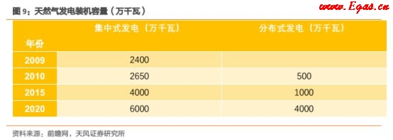 據(jù)中電聯(lián)的《"十三五"天然氣發(fā)電需求預(yù)測(cè)》,預(yù)計(jì)2020年我國天然氣發(fā)電規(guī)模1億千瓦,其中分布式4000萬千瓦。當(dāng)前我國天然氣分布式能源總裝機(jī)容量為500萬千瓦,缺口很大。假設(shè)9F聯(lián)合循環(huán)機(jī)組設(shè)備購置加安裝的平均費(fèi)用為2500元每千瓦,到2020年,集中式天然氣發(fā)電新增市場(chǎng)規(guī)模將達(dá)500億元。假設(shè)天然氣分布式發(fā)電設(shè)備購置及安裝費(fèi)用為3500元每千瓦,到2020年,分布式天然氣發(fā)電設(shè)備新增市場(chǎng)規(guī)模將超過1000億元。