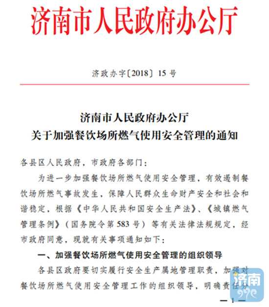 從濟(jì)南市安監(jiān)局獲悉,為進(jìn)一步加強(qiáng)餐飲場(chǎng)所燃?xì)馐褂冒踩芾?,有效遏制餐飲?chǎng)所燃?xì)馐鹿拾l(fā)生,保障人民群眾生命財(cái)產(chǎn)安全和社會(huì)和諧穩(wěn)定,濟(jì)南市政府辦公廳近日印發(fā)《關(guān)于加強(qiáng)餐飲場(chǎng)所燃?xì)馐褂冒踩芾淼耐ㄖ罚ㄒ韵潞?jiǎn)稱《通知》),明確要求各縣區(qū)每半年要至少開展一次餐飲場(chǎng)所燃?xì)馐褂冒踩珜m?xiàng)整治活動(dòng)。