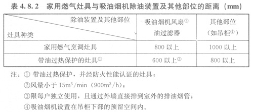 482家用燃?xì)庠罹吲c上方吸油煙機(jī)除油裝置及其他部位的距離宜按表482的規(guī)定執(zhí)行,家用燃?xì)庠罹吲c側(cè)吸式吸油煙機(jī)除油裝置的距離可按本規(guī)程第481條的規(guī)定執(zhí)行。