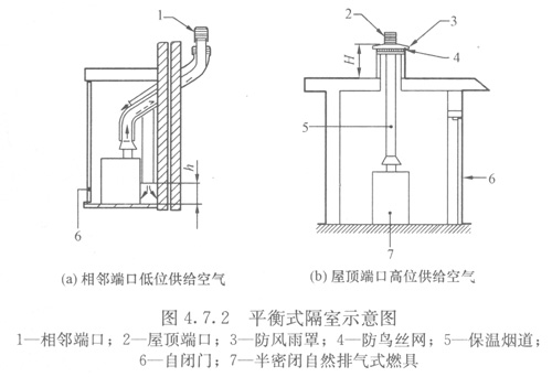 471當(dāng)半密閉自然排氣式燃具安裝部位臨近較高建筑或用氣建筑較高造成煙道過長無法安裝時(shí),或用戶需要的燃具熱負(fù)荷大于35kW時(shí),可設(shè)置平衡式隔室,并將半密閉自然排氣式燃具安裝在平衡式隔室內(nèi)。