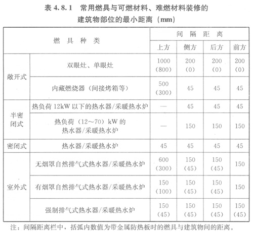 481常用燃具與可燃材料、難燃材料裝修的建筑物部位的最小距離宜符合表481的規(guī)定。