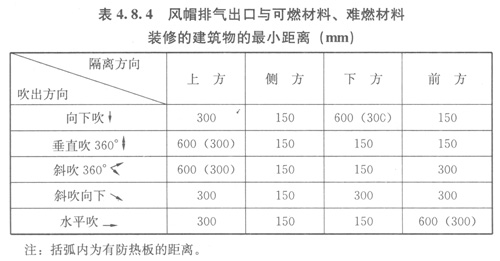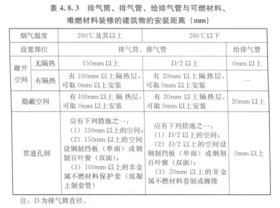 483排氣筒、排氣管、給排氣管與可燃材料、難燃材料裝修的建筑物的安裝距離應(yīng)符合表483的規(guī)定。