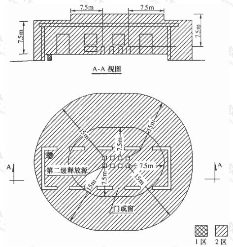 1 以釋放源為中心,半徑為15m,地面以上高度7.5m和半徑為7.5m,頂部與釋放源距離為7.5m的范圍劃為2區(qū);