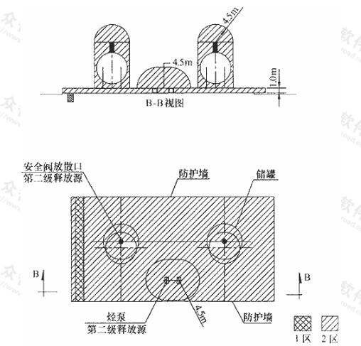 1 以?xún)?chǔ)罐安全閥放散管管口為中心,半徑為4.5m,以及至地面以上的范圍內(nèi)和儲(chǔ)罐區(qū)防護(hù)墻以?xún)?nèi),防護(hù)墻頂部以下的空間劃為2區(qū);
