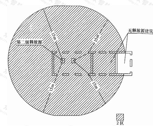 1 以釋放源為中心,按本附錄第E.0.2條規(guī)定的范圍內(nèi)劃分為2區(qū);