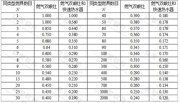 2 表中“燃氣雙眼灶和快速熱水器”是指一戶居民裝設一個雙眼灶和一個快速熱水器的同時工作系數(shù)。