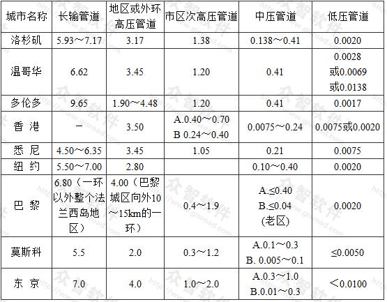 從上述九個特大城市看,門站后高壓輸氣管道一般成環(huán)狀或支狀分布在市區(qū)外圍,其壓力為2.0~4.48MPa不等,一般不需敷設(shè)壓力大于4.0MPa的管道,由此可見,門站后城市高壓輸氣管道的壓力為4.0MPa已能滿足特大城市的供氣要求,故本規(guī)范把門站后燃氣管道壓力適用范圍定為不大于4.0MPa。