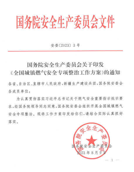 國務(wù)院安全生產(chǎn)委員會關(guān)于印發(fā)《全國城鎮(zhèn)燃?xì)獍踩珜m椪喂ぷ鞣桨浮返耐ㄖ参?023〕3號