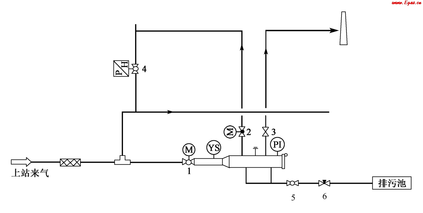 清管站的功能就是收發(fā)清管器。長輸管道的清管作業(yè)有投產(chǎn)前清管和正常運行期間清管。投產(chǎn)前清管的主要目的是清除管道內(nèi)雜質(zhì),主要包括施工期間的泥土、焊渣、水等。正常運行期間的清管是指管道運行一段時間后,由于氣體內(nèi)含有一定的雜質(zhì)積存在管線內(nèi),使管輸效率下降,對管線造成腐蝕等,因此需要對管線進行清管。常見清管站工藝流程圖,如圖3-1所示。
