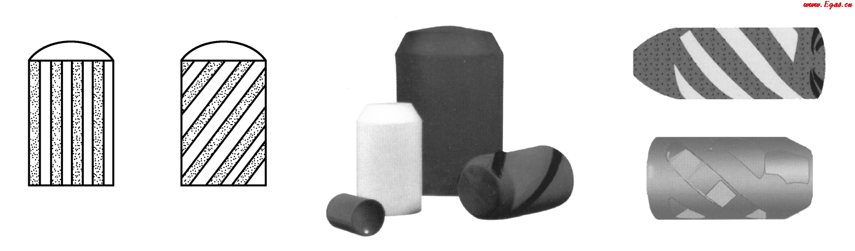 泡沫清管器如圖12-8所示,外貌呈炮彈形,頭部呈半球形或拋物線形,外徑比管線的內(nèi)徑約大2%~4%,尾部呈蝶形凹面,內(nèi)部芯體為高密泡沫,外敷強(qiáng)度高、韌性好和耐油性較強(qiáng)的聚氨酯材料。這種類型清管器的密封性能較好,使清管器前后形成壓差,推動(dòng)清管器向前運(yùn)行。沿清管器周圍有螺旋溝槽或圓孔,可保證體內(nèi)充滿液體,而不致被壓癟。帶有螺旋溝槽的清管器,在運(yùn)行時(shí)螺旋溝槽產(chǎn)生分力,使其旋轉(zhuǎn)前進(jìn),因此清管器磨損均勻。泡沫清管器具有回彈能力強(qiáng)、導(dǎo)向性能好、變形能力高等特點(diǎn),能順利通過變形彎頭、三通及變徑管,特別適合清掃帶有內(nèi)涂層的管道,但它的強(qiáng)度不如刷式清管器高。