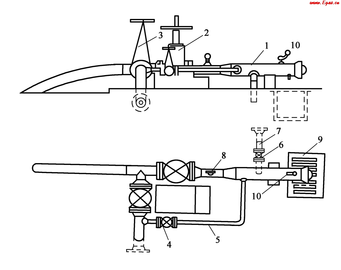 1—接收筒;2—接收閥;3—線路主閥;4—平衡閥;5—平衡管;6—排污閥;7—排污管;8—通過指示器;9—清洗坑;10—放空管和壓力表
