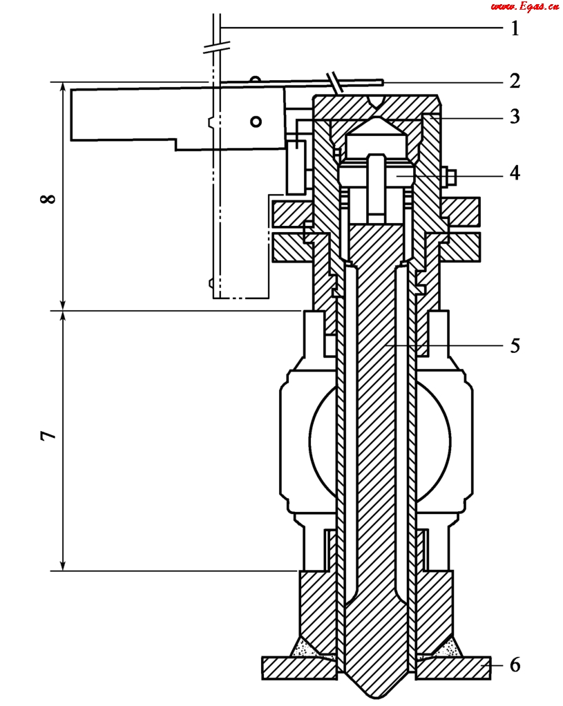 1—揚(yáng)旗(通過位置);2—揚(yáng)旗(未通過位置);3—杠桿;4—轉(zhuǎn)軸;5—頂桿;6—管壁;7—球閥;8—通過指示器
