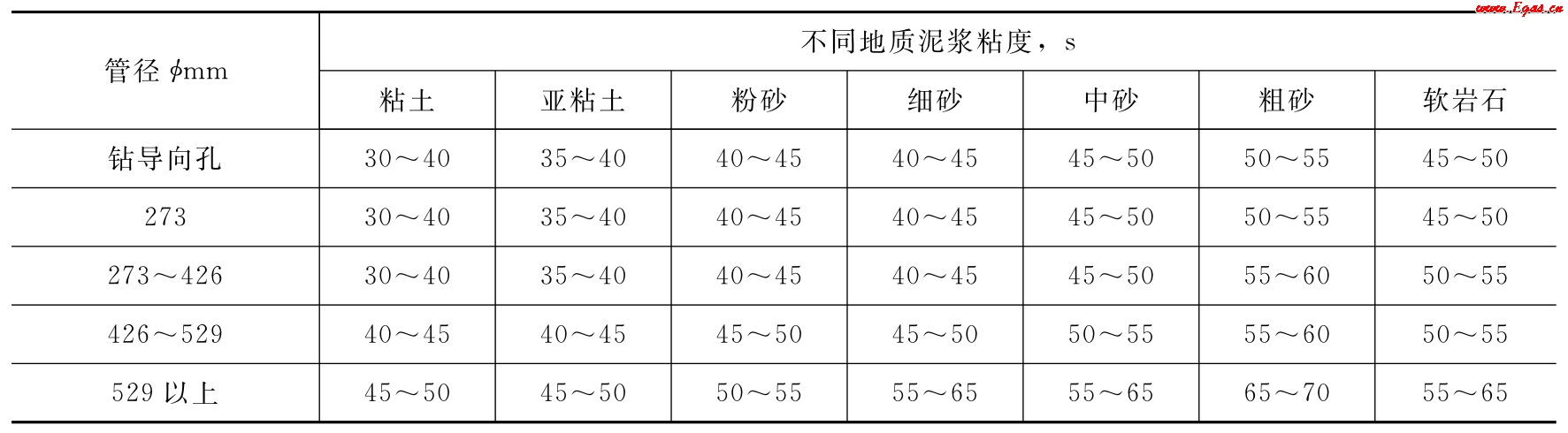 泥漿粘度應(yīng)根據(jù)地質(zhì)情況和管徑大小確定,泥漿粘度值可參照表4-1-1的規(guī)定。定向鉆所采用的泥漿相對(duì)密度為1.1~1.2,泥漿的相對(duì)密度應(yīng)根據(jù)地質(zhì)條件而定,卵石地層應(yīng)加大泥漿的密度。泥漿粘度宜用馬氏漏斗測(cè)量,每2h測(cè)一次。