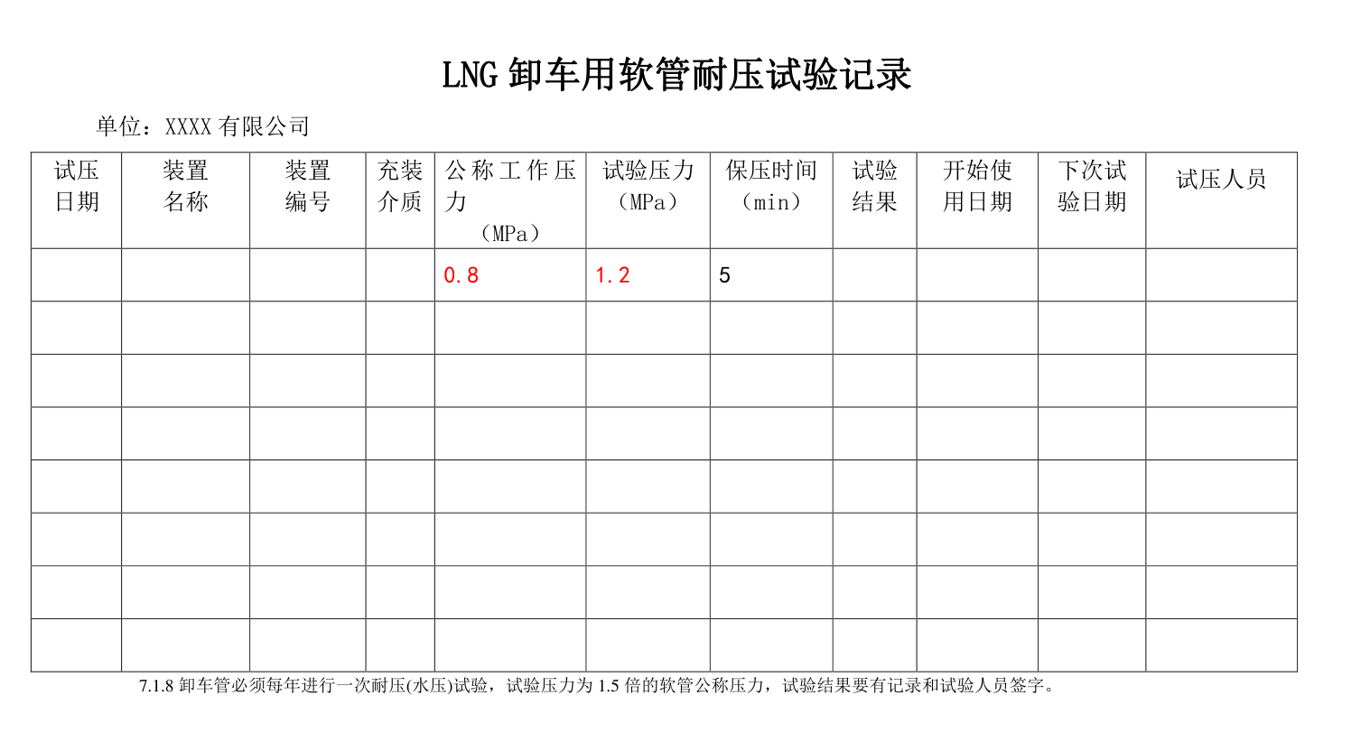 2、 卸車用軟管應(yīng)當每年進行一次耐壓試驗檢查, 試驗壓力為卸車用軟管公稱壓力的 1. 5 倍(液化天然氣卸車用管試驗壓力為 1. 2MPa);