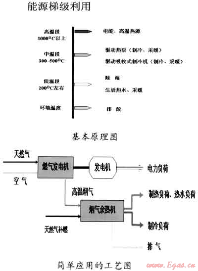 根據(jù)“高能高用、低能低用、溫度對口、梯度利用”的原理,對天然氣燃燒產(chǎn)生的高溫?zé)煔猓ㄟ^發(fā)電機來提供高品位的電能,對發(fā)電機排出的煙氣,根據(jù)用戶的需求,或產(chǎn)生蒸汽、熱水,或轉(zhuǎn)換成冷能,或用于除濕,從而將天然氣所含的能量盡可能地“吃盡榨干”,從而實現(xiàn)能源的高效利用,同時也達到較好的經(jīng)濟性。