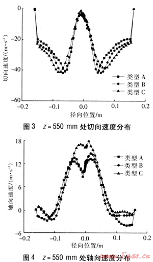 切向速度和軸向速度是影響旋風(fēng)分離器分離效率的重要因素,本文選取z=550、670mm高度上的軸向速度和切向速度,分析柱形空間和環(huán)形空間內(nèi)的切向速度和軸向速度分布。逆時針方向為切向速度的正方向,z軸正方向為軸向速度的正方向。由于本文的旋風(fēng)分離器為順時針切向進(jìn)氣,因此分離器內(nèi)流體的切向速度為負(fù)。入口風(fēng)速為15m/s時,3種類型的旋風(fēng)分離器在z=550mm高度上氣相流體的切向速度分布和軸向速度分布見圖3、4。由圖3、4可知,在柱形空間的外旋渦區(qū),類型A旋風(fēng)分離器壁面切向速度最小,類型B次之,類型C最大。即隨著高寬比的增大,旋風(fēng)分離器壁面附近的流體切向速度增大。類型A旋風(fēng)分離器的切向速度最大值的徑向位置離壁面最遠(yuǎn),類型B次之,類型C最近,即隨著高寬比的增大,切向速度的最大值的徑向位置逐漸向壁面靠攏。在旋風(fēng)分離器內(nèi),固體顆粒主要是在高速旋轉(zhuǎn)產(chǎn)生的離心力作用下從氣體中分離出來的。當(dāng)分離器的高寬比增大時,壁面附近的切向速度變大,最大切向速度的徑向位置更靠近壁面。由于壁面切向速度變大以及外旋渦向壁面靠近,氣固兩相流中的顆粒所受的離心力變大,更容易擺脫氣相流體的牽引,被壁面捕集而被分離,從而提高分離效率。