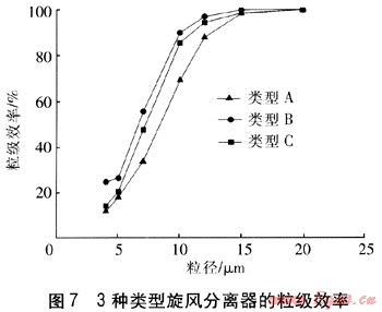 粒級效率是指某一給定粒徑或粒徑范圍的分離效率,切割粒徑是分離效率為50%時的顆粒粒徑。粒級效率圖可以清晰表明旋風(fēng)分離器對不同粒徑顆粒的分離性能。3種類型旋風(fēng)分離器的粒級效率見圖7。由圖7可知,類型B旋風(fēng)分離器的切割粒徑最小。3種類型旋風(fēng)分離器的分離效率分別為:A:88.71%,B:91.54%,C:90.27%。因此,當(dāng)入口高寬比增大或減小時,分離器的切割粒徑都變大,從而使分離器的分離效果變差。在實際工程運用中,應(yīng)當(dāng)保持旋風(fēng)分離器入口高寬比在一個合適范圍內(nèi),使得旋風(fēng)分離器具有最佳的分離效率。