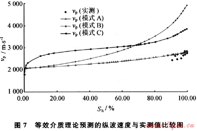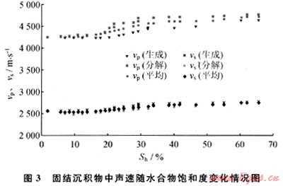在固結(jié)沉積物實(shí)驗(yàn)中,筆者發(fā)現(xiàn)低飽和度的水合物(飽和度小于10%)對(duì)聲速影響不明顯的現(xiàn)象,這種現(xiàn)象也被不同學(xué)者所捕捉[19~20]。經(jīng)上述分析后認(rèn)為,水合物在沉積物孔隙流體中形成,對(duì)聲速影響不大,可能是造成這一現(xiàn)象的原因。而當(dāng)水合物膠結(jié)沉積物顆粒時(shí),其對(duì)聲速的影響則可能成倍增長(zhǎng),如在松散沉積物中,微量的水合物(飽和度1%左右)即可使縱波速度增長(zhǎng)200~300m/s??梢?jiàn),在天然氣水合物的資源評(píng)價(jià)中,了解水合物的微觀分布同樣具有重要的作用。