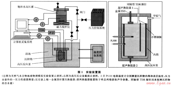 實(shí)驗(yàn)在青島海洋地質(zhì)研究所水合物實(shí)驗(yàn)室地球物理模擬實(shí)驗(yàn)裝置上進(jìn)行,該裝置主要由高壓反應(yīng)釜及內(nèi)筒、溫控系統(tǒng)、壓力控制系統(tǒng)、測(cè)試系統(tǒng)(包括超聲探測(cè)和時(shí)域反射探測(cè))和數(shù)據(jù)采集系統(tǒng)5大功能模塊組成(圖1)。實(shí)驗(yàn)過(guò)程為:在高壓反應(yīng)釜中模擬海底真實(shí)的溫度壓力條件,使水合物在沉積物中形成,同時(shí)采用超聲探測(cè)技術(shù)和時(shí)域反射技術(shù)(TDR,Time Domain Reflectometry)實(shí)時(shí)探測(cè)全過(guò)程中沉積介質(zhì)的聲學(xué)參數(shù)和水合物飽和度。為加快水合物生成進(jìn)程,實(shí)驗(yàn)采用300mg/L的SDS(十二烷基硫酸鈉)溶液和99.99%甲烷生成水合物。實(shí)驗(yàn)的詳細(xì)介紹見(jiàn)本文參考文獻(xiàn)[8]、[9]。