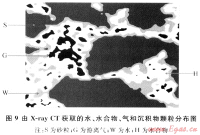 松散沉積物中的水合物微觀分布已由Jin等[18]通過(guò)X射線斷層掃描直接觀測(cè)(圖9)。結(jié)果表明水合物和沉積物顆粒間由水隔開(kāi),即水合物以懸浮狀形態(tài)存在于孔隙流體中,與筆者實(shí)驗(yàn)中利用聲速所推測(cè)的結(jié)果一致。