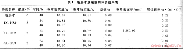 參照SY/T5390—91鉆井液腐蝕性能評(píng)價(jià)方法,在溫度120℃密閉條件下,熱滾16h后,測(cè)定了包括地層水及咪唑啉(SL-HS2)和聚季銨鹽(DG-HS1)、有機(jī)磷酸鹽(SL-HS3)復(fù)合緩蝕劑等在內(nèi)的3種介質(zhì)進(jìn)行了腐蝕速率的測(cè)定結(jié)果見表1。
