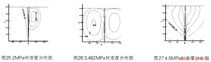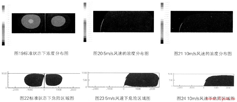 由圖19、20、21可以看出,隨著風(fēng)速的從無到有,從小變大,濃度擴(kuò)散區(qū)域也向右明顯偏轉(zhuǎn),并且擴(kuò)散區(qū)域變大,當(dāng)風(fēng)速為10m/s時,擴(kuò)散區(qū)域已經(jīng)超過了界定的區(qū)域。并且危險區(qū)域也隨風(fēng)速變大而擴(kuò)大,波及到下風(fēng)向的近地面。