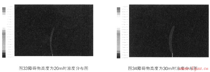 比較圖33和圖34可以看出,障礙物較高會對擴(kuò)散的天然氣起到了進(jìn)一步的抬升作用,使天然氣開始偏轉(zhuǎn)擴(kuò)散的高度進(jìn)一步升高。