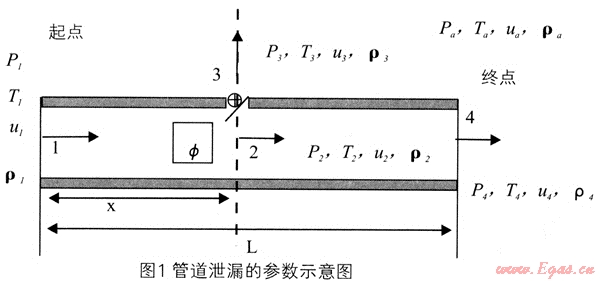 計算參數(shù)如圖1所示,管道起點為1,終點為4,長度為L,在距起點X處存在一點,發(fā)生泄漏。圖中:P1,T1,u1,ρ1表示管道起點的運行壓力、溫度、氣體速度以及氣體密度;P2,T2,u2,ρ2表示與泄漏孔中心在同一直線上的管道內(nèi)某點的運行壓力、溫度、氣體速度以及氣體密度;P3,T3,u3,ρ3表示泄漏點的運行壓力、溫度、氣體速度以及氣體密度;P4,T4,u4,ρ4表示這段管道終點處的運行壓力、溫度、氣體速度以及氣體密度;Pa,Ta,ua,ρs為管道外大氣的壓力,溫度,風(fēng)速和空氣的密度。