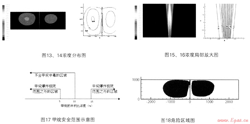 圖22、圖23和圖24是各自情況下的危險區(qū)域的圖,圖中紅色的部分表示甲烷的濃度處于爆炸極限范圍內(nèi),是有爆炸危險的區(qū)域。
