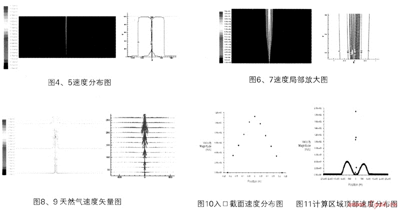 圖4、圖5可以看出,天然氣高速泄漏到大氣中,形成自由射流,在泄漏孔口處速度很高,但隨著高度增大速度降低很快,這是因為天然氣與空氣對流,空氣對天然氣有很大的阻力造成的。由圖6、圖7可以看出,同一截面上中心處的流速最大,離中心線越遠(yuǎn)處的流速越小。隨著射流向上流動,其中心線處的流速逐漸減小,射流的寬度逐漸增大。