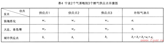 假設(shè)有m個(gè)外來(lái)氣源點(diǎn),n個(gè)該城區(qū)燃?xì)夤?yīng)(銷售)點(diǎn)。則令以a1,a2,…am表示各外來(lái)氣源點(diǎn)運(yùn)至該市的輸出量,b1,b2,…,bn表示各供應(yīng)(銷售)點(diǎn)的燃?xì)馊菁{量(銷售量),有∑ai=∑bj。xij表示氣源地i運(yùn)往供應(yīng)點(diǎn)j的運(yùn)氣量,wij表示相應(yīng)的單位運(yùn)氣量的運(yùn)輸時(shí)間(單位運(yùn)氣量的運(yùn)輸時(shí)間因運(yùn)輸方式的不同而改變),如表2所示