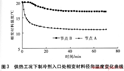 供熱工況下制冷劑入口處相變材料徑向溫度變化曲線見(jiàn)圖3。由圖3可知,在供熱工況下,系統(tǒng)開(kāi)始運(yùn)行初期,相變材料徑向各節(jié)點(diǎn)間溫度的差異較大,鄰近制冷劑管壁的節(jié)點(diǎn)A溫度下降較快,而與水管壁相鄰的節(jié)點(diǎn)B溫度幾乎不變,直至30min后相變材料溫度場(chǎng)達(dá)到穩(wěn)定狀態(tài),之后沿徑向各個(gè)節(jié)點(diǎn)的相對(duì)溫差固定。