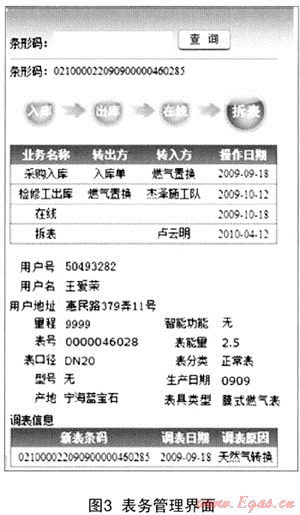 如圖3管理者按條碼查詢單個表具時,系統(tǒng)將表具的出產(chǎn)地、型號、生產(chǎn)日期、表能量、出入庫、領(lǐng)用安裝信息,用戶的歷史調(diào)表記錄、調(diào)表原因信息等多系統(tǒng)數(shù)據(jù)展現(xiàn)在同一界面上,通過各個環(huán)節(jié)操作日期與用戶調(diào)表記錄的分析,管理者可直觀從中發(fā)現(xiàn)表具管理過程中的問題與不足,以及用戶氣行為的情況。