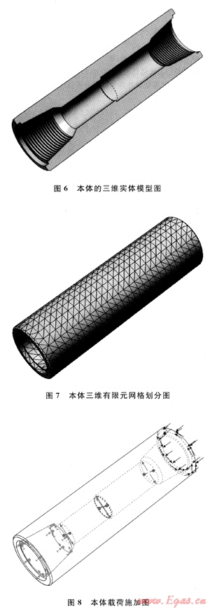利用SolidWorks三維CAD軟件,得到的本體的三維實體模型(見圖6),利用COSMOS/Works自動劃分網(wǎng)格,建立有限元模型(見圖7、8)。劃分好的有限元模型與實體模型基本吻合,無“贅余”與“凹陷”,劃分較為準確。