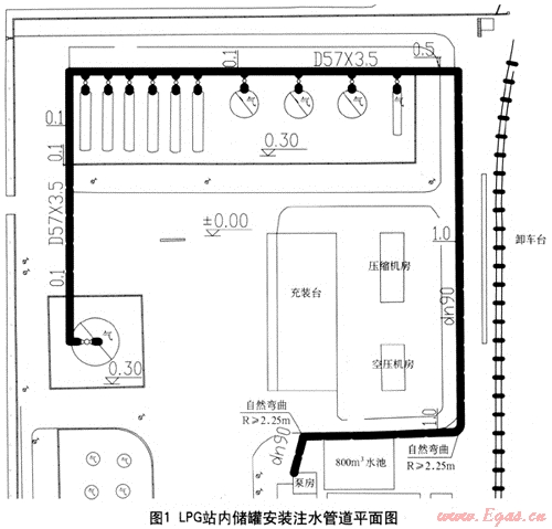 東莞新奧燃氣有限公司擁有LNG儲配站和LPG儲配站各一座。LPG站內(nèi)有1000m3LPG球罐1座,200m3LPG臥罐3座,100m3LPG臥罐6座,儲存總?cè)莘e為2200m3,圖1為我LPG站內(nèi)儲罐安裝注水管道平面圖。