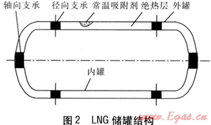 橇裝式LNG加氣站的LNG儲(chǔ)罐采用臥式、雙層金屬結(jié)構(gòu)的絕熱低溫儲(chǔ)罐,其結(jié)構(gòu)見(jiàn)圖2。內(nèi)罐一般采用奧氏體不銹鋼材料,如0Cr18Ni9、304等。外罐多采用普通低合金鋼,如16MnR。內(nèi)外罐之間的支承宜采用在低溫下既有較高強(qiáng)度又有較低熱導(dǎo)率的低溫玻璃鋼結(jié)構(gòu)。采用的絕熱方式主要有4種:堆積絕熱、真空粉末絕熱、高真空絕熱、高真空多層絕熱[6]。其中高真空多層絕熱以絕熱空間小、熱導(dǎo)率低、絕熱可靠等優(yōu)勢(shì),在LNG儲(chǔ)罐上得到廣泛應(yīng)用,尤其適用于移動(dòng)式低溫儲(chǔ)罐。對(duì)于高真空多層絕熱,維持夾層的真空度至關(guān)重要。首先,在抽真空時(shí)要確保腔內(nèi)材料充分放氣,并確保多層材料層間真空度達(dá)到規(guī)定要求;其次,可在腔內(nèi)放置常溫吸附劑,或采用添加吸附劑的層間隔熱材料,如填炭紙等,以吸附腔內(nèi)材料可能釋放出的少量氣體[7]。