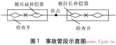 在直埋管道管系中,為減少固定支座的數量,往往布置成“駐點”形式。直埋管道兩個規(guī)格型號相同的相鄰補償器之間管道中點不設固定點,當管道受熱均勻膨脹時,在兩個補償器中間必然形成一個力的相對平衡點,即駐點。理論上以該點為界,管道向左右兩個方向均勻膨脹,一般認為,力的平衡點會因管道受力不均勻而發(fā)生少許偏移,一般按20%余量進行考慮。筆者認為,這種布置方式值得商榷。武威市城南集中供熱有限責任公司有一段直埋管道(Ø630×10)采用這種布置方式,固定支座之間距離為206m,兩只補償器規(guī)格型號完全相同,補償量均為150mm。在2008年熱網運行中,其同側兩個補償器相繼發(fā)生故障,拆解后發(fā)現,一個補償器已被壓扁,壓縮量200mm,另一個不僅未起到補償壓縮作用,反而被拉長50mm,一個補償器伸長對另一個補償器造成過度壓縮,從而使兩個補償器均發(fā)生破壞失效,事故管段示意圖見圖1。