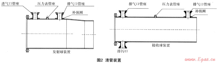 清管裝置用于管道清掃,分為發(fā)射球裝置和接收 球裝置兩部分(如圖2)。
