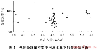 1) 氣體處理量不變條件下,分離效率隨注水量的變化無(wú)明顯的規(guī)律可循。但都具有較好的氣-水分離效果,其分離效率在90%以上,平均在95%左右(圖2)。