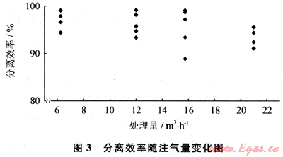 2) 當(dāng)注氣量增加時(shí),分離效率略有降低,但分離效率基本在90%以上(圖3)。