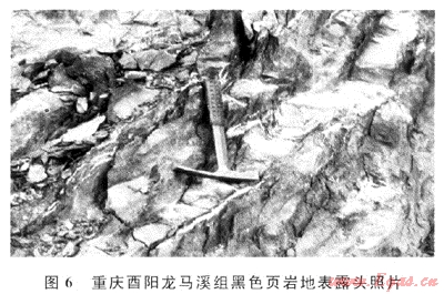 區(qū)內(nèi)上奧陶統(tǒng)-下志留統(tǒng)筆石頁(yè)巖普遍發(fā)育且分布穩(wěn)定,深灰色、黑色碳質(zhì)、硅質(zhì)泥頁(yè)巖埋深在1500~4000m之間,有機(jī)質(zhì)類型均屬腐泥型,殘余總有機(jī)碳含量平均為2.28%[20],目前多處于高成熟演化階段[22],成熟度平均值均大于1.5%。在最近完鉆的探井中(如丁山1井、建深1井龍馬溪組),氣顯示(井涌及氣測(cè)等)異常在鉆井過(guò)程中頻繁出現(xiàn)[11、26]。依據(jù)頁(yè)巖類型和礦物學(xué)特征分析表明:該套頁(yè)巖具有脆性巖石組分[26],野外實(shí)測(cè)剖面中可見風(fēng)化的頁(yè)巖破碎帶(圖6),在鉆井巖心中也發(fā)現(xiàn)了十分發(fā)育的高角度微裂縫,指示該區(qū)頁(yè)巖易于發(fā)生脆性裂縫。