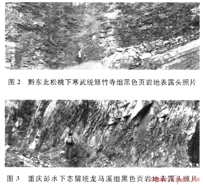 從地表頁(yè)巖出露情況分析認(rèn)為,筇竹寺組黑色頁(yè)巖(圖2)主要分布于川南的宜賓-瀘州、川東的達(dá)州-墊江-長(zhǎng)壽一帶和黔北的金沙-江口-松桃一線以南地區(qū),渝東南的秀山、酉陽(yáng)和湘鄂西的龍山、咸豐等地區(qū)也較為發(fā)育;五峰組-龍馬溪組筆石頁(yè)巖(圖3)主要發(fā)育于盆地邊部且相對(duì)穩(wěn)定,在川南的宜賓、瀘州、南川、綦江,川東的石柱、涪陵,渝東南的武隆-彭水-黔江,黔東北的道真-德江及鄂西的利川-咸豐-來(lái)鳳一帶發(fā)育完整,而在盆地腹部的樂(lè)山-龍女寺一線以西北,由于后期構(gòu)造抬升剝蝕而缺失。以上2套黑色頁(yè)巖熱演化程度普遍較高且已被證實(shí)為重慶及其周緣地區(qū)海相地層的主要?dú)庠磶r[16]。