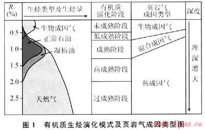 與常規(guī)油氣藏的成藏條件不同,頁巖氣來源由生物成因氣和熱成因氣組成,吸附氣和游離氣并存,具有自生自儲(或短距離運(yùn)移)的特征。因此頁巖氣聚集受埋藏深度、有機(jī)質(zhì)的成熟度及輸導(dǎo)、封蓋條件制約較小。埋藏較淺、有機(jī)質(zhì)成熟度低的區(qū)段發(fā)育生物成因的頁巖氣;埋藏深、有機(jī)質(zhì)成熟度高的區(qū)段發(fā)育熱成因的頁巖氣;埋藏深度和有機(jī)質(zhì)成熟度中等偏低的區(qū)段發(fā)育混合成因的頁巖氣(圖1)。美國第一口頁巖氣發(fā)現(xiàn)井深度最淺,還不足10m,而Haynesville頁巖氣聚集最大深度則近4000m;Antrim頁巖氣的有機(jī)質(zhì)成熟度(Ro)僅為0.4%~0.6%,Lewis頁巖氣的Ro則為1.6%~1.9%,頁巖氣聚集的Ro最大可達(dá)3%[24~33]。