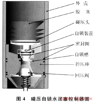 碰壓自鎖水泥塞控制器(圖4)上部采用碰壓膠塞與控壓座構(gòu)成碰壓自鎖機(jī)構(gòu),下部采用回壓閥與控壓座構(gòu)成回壓控制機(jī)構(gòu)。它主要由外殼、控壓座、碰壓自鎖膠塞、回壓閥等部分組成。
