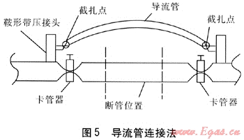 在采用局部管段間隔斷管管道連接作業(yè)前,在卡管器前、后分別焊接鞍形帶壓接頭,在帶壓不停氣的條件下使導(dǎo)流管正常運行。導(dǎo)流管流通面積及前后鞍型帶壓接頭數(shù)量根據(jù)下游用戶實際用氣量確定,連接方式同并聯(lián)鞍形帶氣接頭作業(yè)法。待導(dǎo)流管運行正常后,按局部管段間隔斷管管道連接作業(yè)法實現(xiàn)新建聚乙烯管道與已運行聚乙烯管道連接。管道連接完成后,采用卡管器在截扎點位置將導(dǎo)流管斷開并用對焊堵頭封嚴(yán),此作業(yè)法完成。我們于2007年8月在西青區(qū)楊柳青鎮(zhèn)明月華苑紅線外天然氣工程中實施此作業(yè)法,取得了良好的效果。