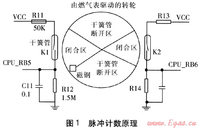 目前我國(guó)的IC卡燃?xì)獗砭捎妹}沖計(jì)數(shù)方式,即在原基表機(jī)械計(jì)數(shù)器上加裝脈沖傳感裝置如干簧管、霍爾元件等,產(chǎn)生脈沖輸出,電子控制器對(duì)采集到的脈沖進(jìn)行累計(jì)和換算,獲得數(shù)據(jù)。目前廣泛使用干簧管計(jì)數(shù),脈沖計(jì)數(shù)原理見(jiàn)圖1。