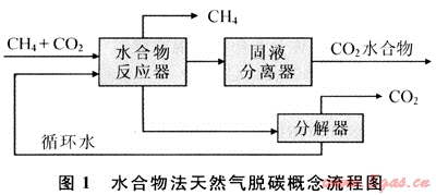 圖1為利用水合物分離技術(shù)進行天然氣中捕集CO2的流程:將經(jīng)過預(yù)處理過酸性天然氣通入水合反應(yīng)器,在合適的操作條件下使混合氣中易生成水合物的CO2組分生成CO2水合物,被提濃的CH4自反應(yīng)器頂部引出。所生成的CO2水合物經(jīng)脫水后可直接利用[20],或隨水轉(zhuǎn)入水合物分解器中,分解后回注油氣藏以提高采收率。分解后的水或水與添加劑的混合物返回水合反應(yīng)器,循環(huán)利用。