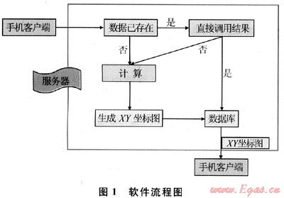 由于該軟件采用循環(huán)迭代試算法求解,涉及的數(shù)據(jù)計算量較大。因此,主要計算功能無法用手機完成,需要與服務(wù)器進行數(shù)據(jù)通訊,采用的方式如圖1所示。由手機客戶端提交計算參數(shù),利用主控服務(wù)器進行計算,計算后利用計算結(jié)果產(chǎn)生直觀的XY坐標圖,再將圖片傳輸回手機并顯示。