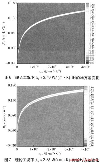 運(yùn)用參數(shù)估計(jì)法,給λs賦值:1.92、2.40、2.88W/(m·K),在參數(shù)估計(jì)中,分別對(duì)cp,s、Rb在一定的取值范圍內(nèi)連續(xù)賦值。通過(guò)計(jì)算機(jī)編程計(jì)算得到模擬工況下的均方差變化情況見(jiàn)圖12~14,圖右側(cè)色標(biāo)為均方差。由圖12~14可知,模擬工況下的結(jié)果不理想,均方誤差較小的淺色云圖中深色區(qū)域?qū)?yīng)多組cp,s、Rb,這樣就很難確定哪組數(shù)值是最優(yōu)值,即在參數(shù)估計(jì)中對(duì)其他參數(shù)的影響比較大。