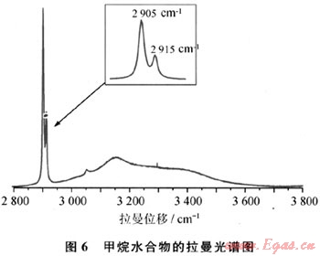 氣體水合物的結構有以下4種:Ⅰ型(立方晶體結構)、Ⅱ型(菱形晶體結構)、H型(六方晶體結構)以及新近發(fā)現的T型(它是由生物分子和水分子生成的),其中前面3種較為常見。Ⅰ型結構含46個水分子和最多8個氣體分子,Ⅱ型結構含136個水分子和最多24個氣體分子,H型結構含34個水分子和最多6個氣體分子。對水合物結構進行分析,主要采用激光拉曼光譜、核磁共振和X-衍射法。Sum等[12]的研究表明激光拉曼光譜是一個很有潛力的測定水合物晶體結構的工具,它可以測定水合物晶腔中氣體分子的伸縮振動的拉曼位移(Raman Shift),而且拉曼強度與分子的數量成正比。圖6為實驗測得的甲烷水合物的拉曼譜圖,小圖中2905cm-1和2915cm-1附近分別是處于大、小籠中甲烷分子的伸縮振動拉曼峰。純甲烷氣體的拉曼譜峰在2917cm-1附近,水合物中甲烷分子的伸縮振動峰發(fā)生分裂呈現雙峰,而且向低波數遷移,這主要是由于水合物中甲烷分子填充在水分子通過氫鍵構建起來的籠子中,甲烷分子與大、小籠之間的相互作用不同,所處的化學環(huán)境存在差異,從而使得甲烷的拉曼譜峰發(fā)生分裂。甲烷分子化學環(huán)境的差異也說明甲烷水合物中兩種籠型結構的存在。實驗測得甲烷水合物大、小籠拉曼峰強度(峰面積)的比值基本上都為3:1,這與工型結構水合物晶胞中大、小籠的個數比是一致的(工型結構一個晶胞中包括6個籠和2個小籠),由此可以斷定甲烷水合物為工型結構水合物。水合物的拉曼譜圖中,3078cm-1附近的峰是O—H鍵的伸縮振動位移,是水合物中與氣體分子相結合的水的拉曼峰。根據甲烷雙峰和結構水峰可以很容易地將水合物與自由氣以及冰加以區(qū)分。